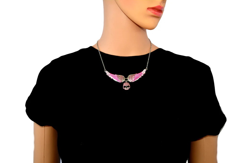 / Stainless Steel Crystal Wing Pink Skull Necklace